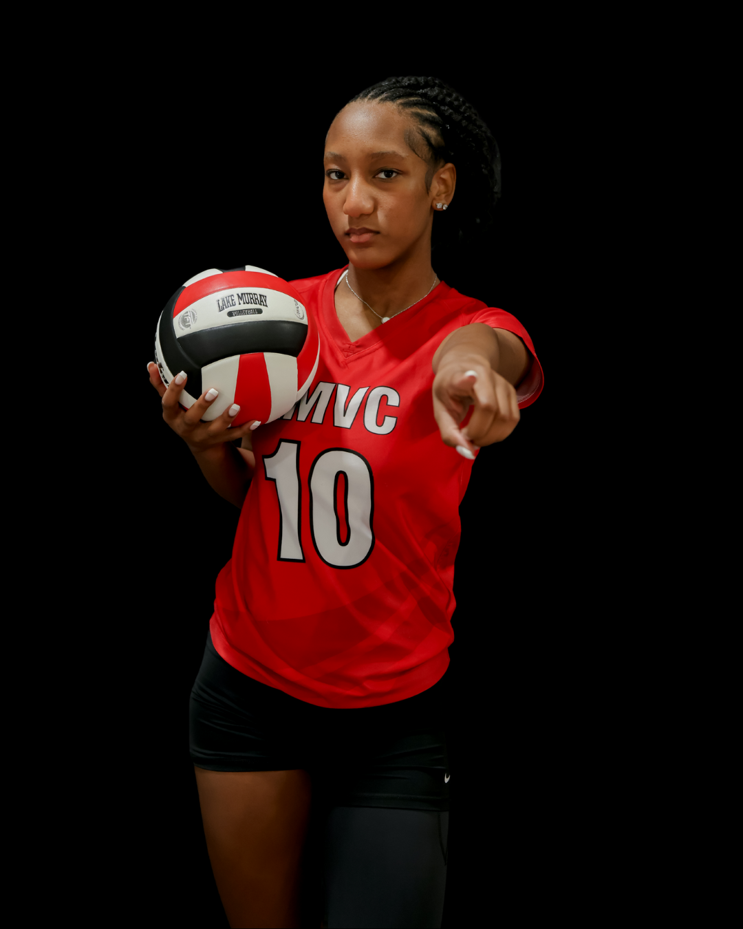 I stay positive and focused on the court, and I lead by example by working hard, supporting my teammates, and staying coachable.